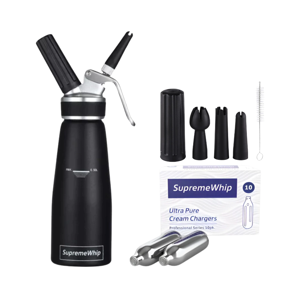 Prepara crema chantilly, espumas y salsas con este sifón de 500 ml de capacidad, resistente y versátil. Perfecto para preparaciones frías. Y con 10 cápsulas, compatibles con todos los sifones estándar. Estas están diseñadas para uso alimentario y aseguran una textura uniforme y una consistencia ideal.